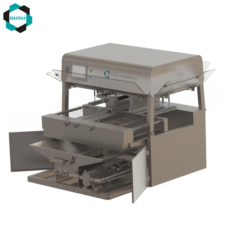 姑蘇機械新一代TYJ系列巧克力涂衣機,使用漿料斗里的漿料,對其下方通過的物料外表不停地浸涂巧克力漿料,來達到涂層的目的;料缸采用可移出式,非常便于清洗,只須簡單拆卸,就可將料缸移出機外。