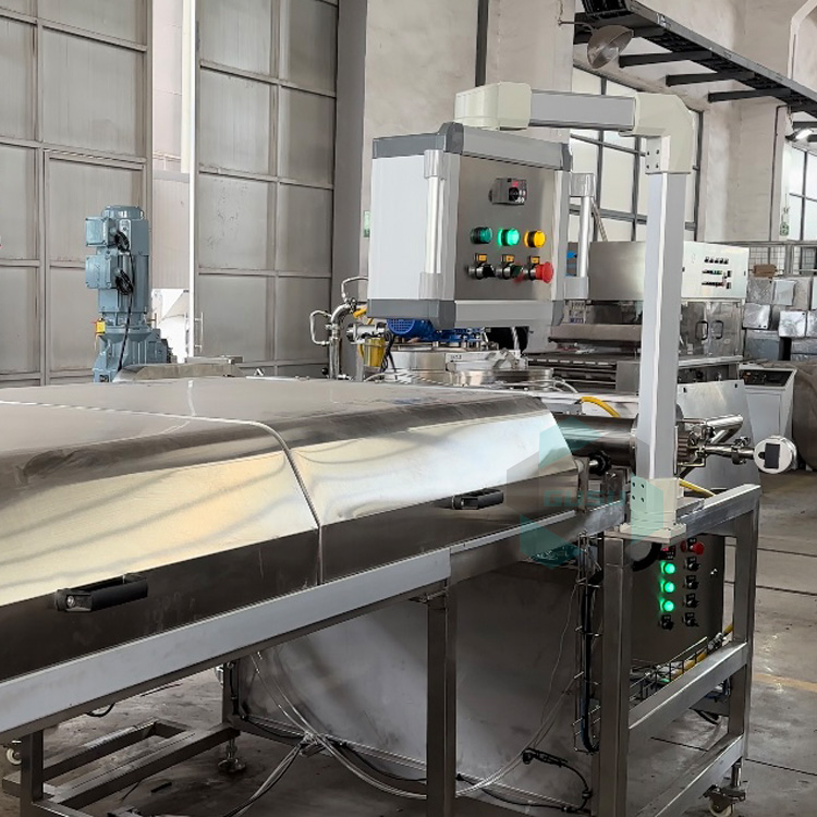 本周姑蘇機械對巧克力滾筒滴澆生產線進行了測試,該設備是生產小顆粒狀及紐扣狀巧克力產品的專用設備,通過供漿系統及壓力控制器、高精度滾澆在食品級PU輸送帶上,進冷道冷卻后自動脫落而成。